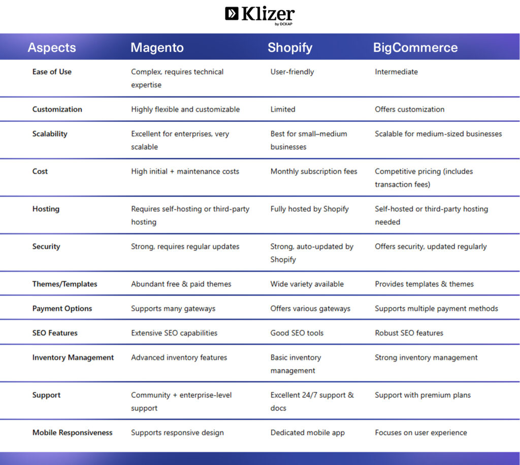 Comparison Table: Magento vs. Shopify vs. BigCommerce